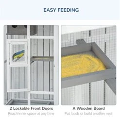 - – EASY FEEDING: This outdoor birdcage has a wooden square board on top of 2 wooden slats to hold your bird’s food. The raised edges make it so your bird can’t make a mess while eating.