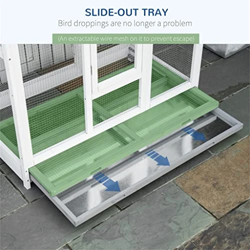 - – Slide-out tray to catch bird droppings with a wire mesh to prevent escape