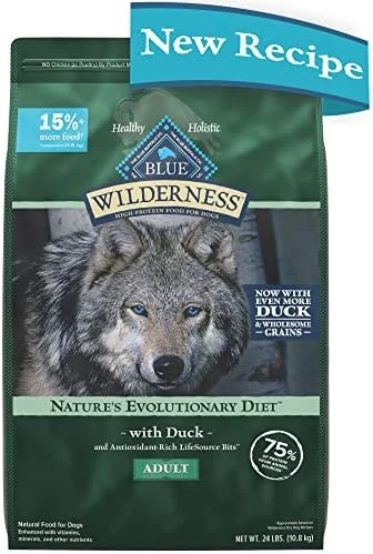 - Contains one (1) 24 lb bag of BLUE Wilderness High Protein Natural Adult Dry Dog Food plus Wholesome Grains, Chicken