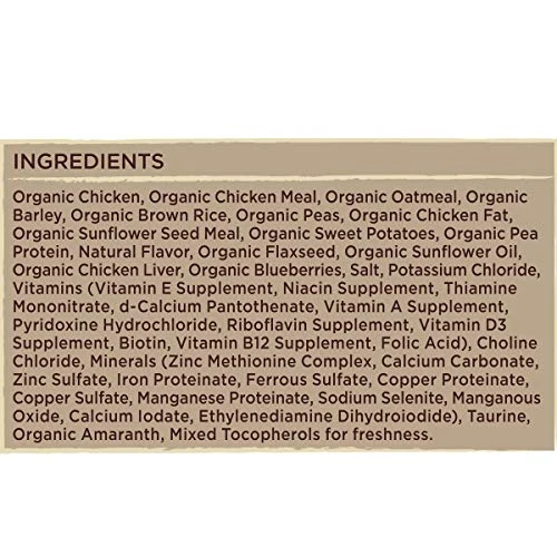 - This organic dry dog food also contains organic oatmeal and organic barley to help support healthy digestion
