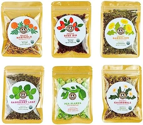 - Convenient Packaging — The GuineaDad Herbal Treat lid has 2 hole feeders so you can control the portion of the treat with 1 hand; The outer packaging blocks out sunlight to keep your treats fresh
