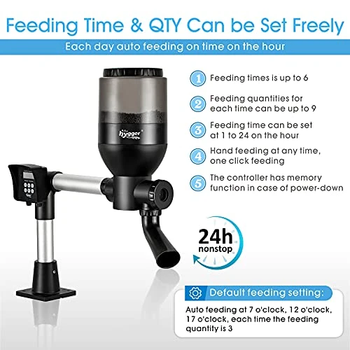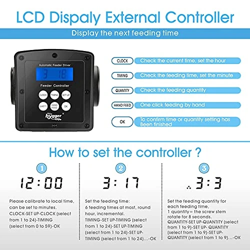 - 【LCD Display Controller】the controller will display the next feeding time. Before set the feeding time and quantity, you should firstly set the controller time to your local time, can be set to minutes. Then you set the feeding times (1 to 24) for each day, then you set the feeding quantities (1 to 9) for each feeding time. The power cord to the controller is 16ft, the controller cord to the feeder is 1.6ft