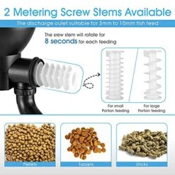- 【2 Screw Stem Available】the fish feeder comes with 2 sizes of metering screw stems, the narrow is for small portion feeding, the wide is for large portion feeding. Please note that for each feeding quantity, the screw stem will rotate for 8 seconds, the small auger will dispense 25 to 30 grams of fish food, the large auger will dispense about 90 grams of fish food