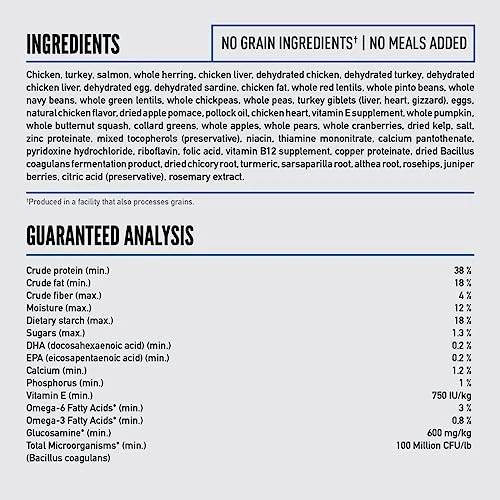 - The first five ingredients are free run*** chicken, free run*** turkey, flounder, whole mackerel and chicken liver to provide your dog with a strong source of protein, vitamins and minerals