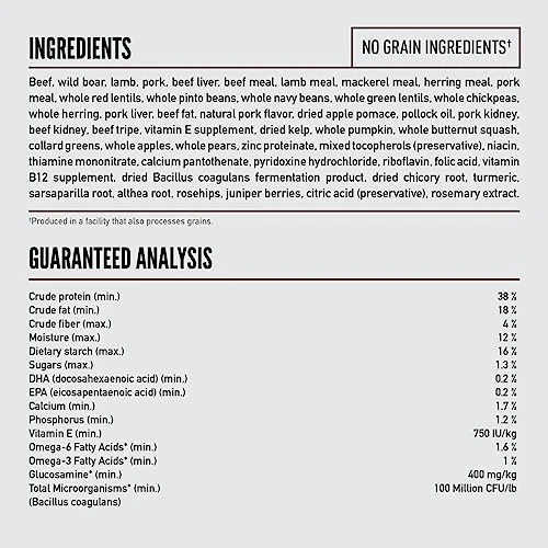 - The first five ingredients are fresh or raw farm-raised beef, wild boar, lamb, pork and beef liver to give your dog a strong daily source of protein, vitamins and minerals